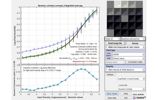 The physical chart consists of layers of 8×10 inch photographic film. The chart contains 20 large patches with densities ranging from base + 0.15 to base + 4.90 (OD = Optical Density) in steps of 0.25 OD, equivalent to 95 dB. (If the lightest and darkest small patches are included, the total density range is 5.1 OD = 102 dB.) Inside each large square there are four color squares: light and dark gray, red and blue. The gray patches are 0.15 OD above and below the surrounding square. The difference, 0.30 OD, is a 2:1 contrast ratio.